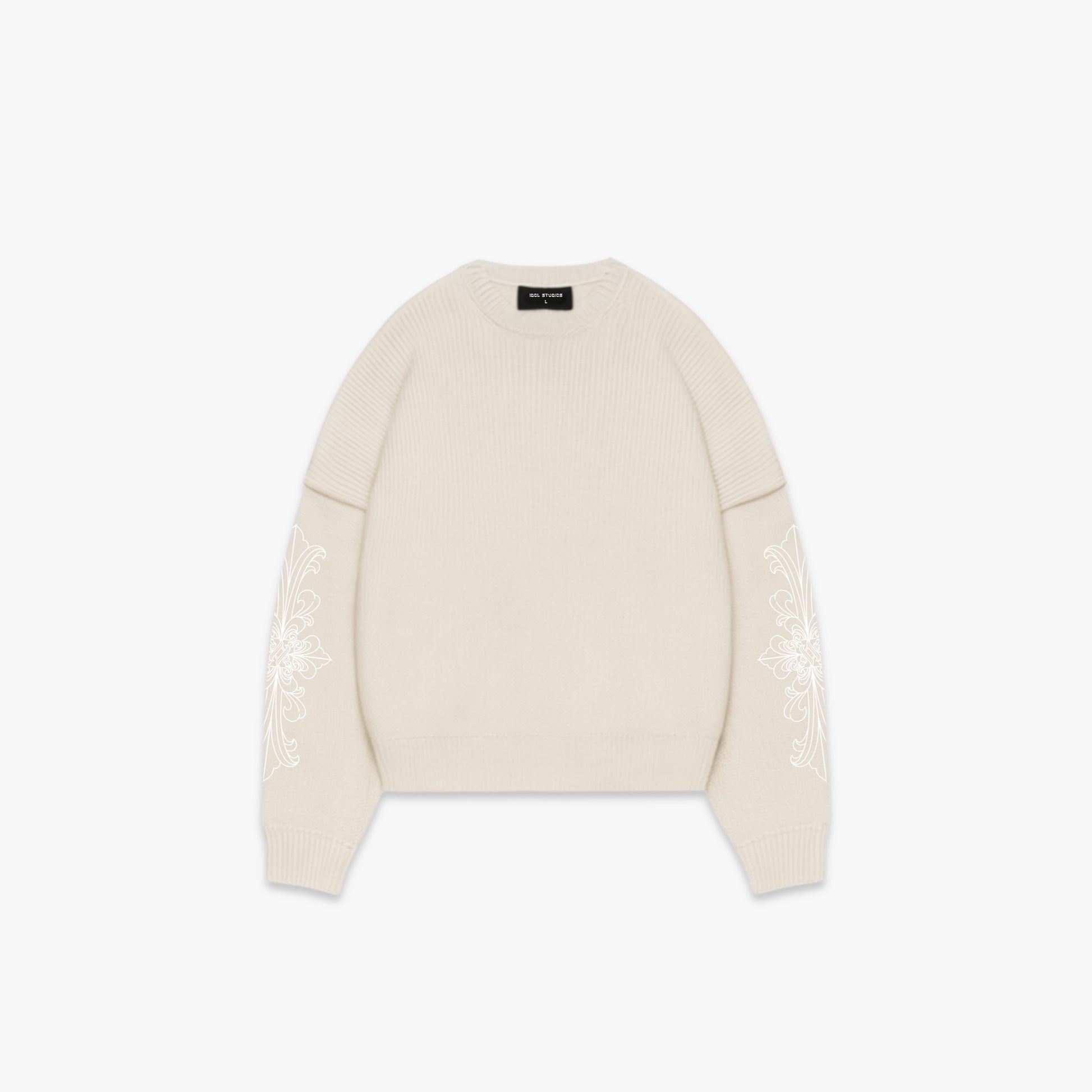 Beige oversized fit knit crafted from a premium cotton blend. Soft to the touch and garment washed for a refined, lived-in feel. Finished with embroidered logo detailing along the sleeves and ribbed trims.