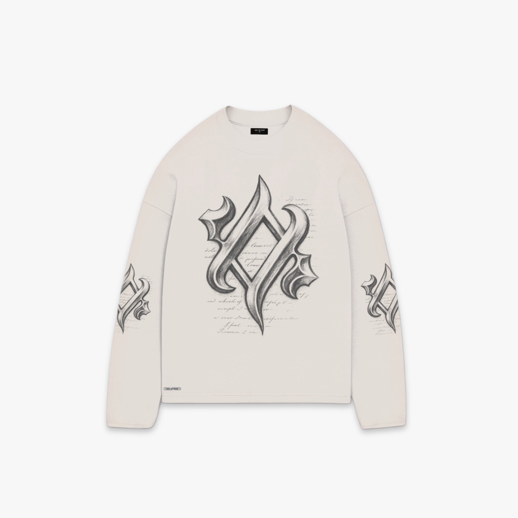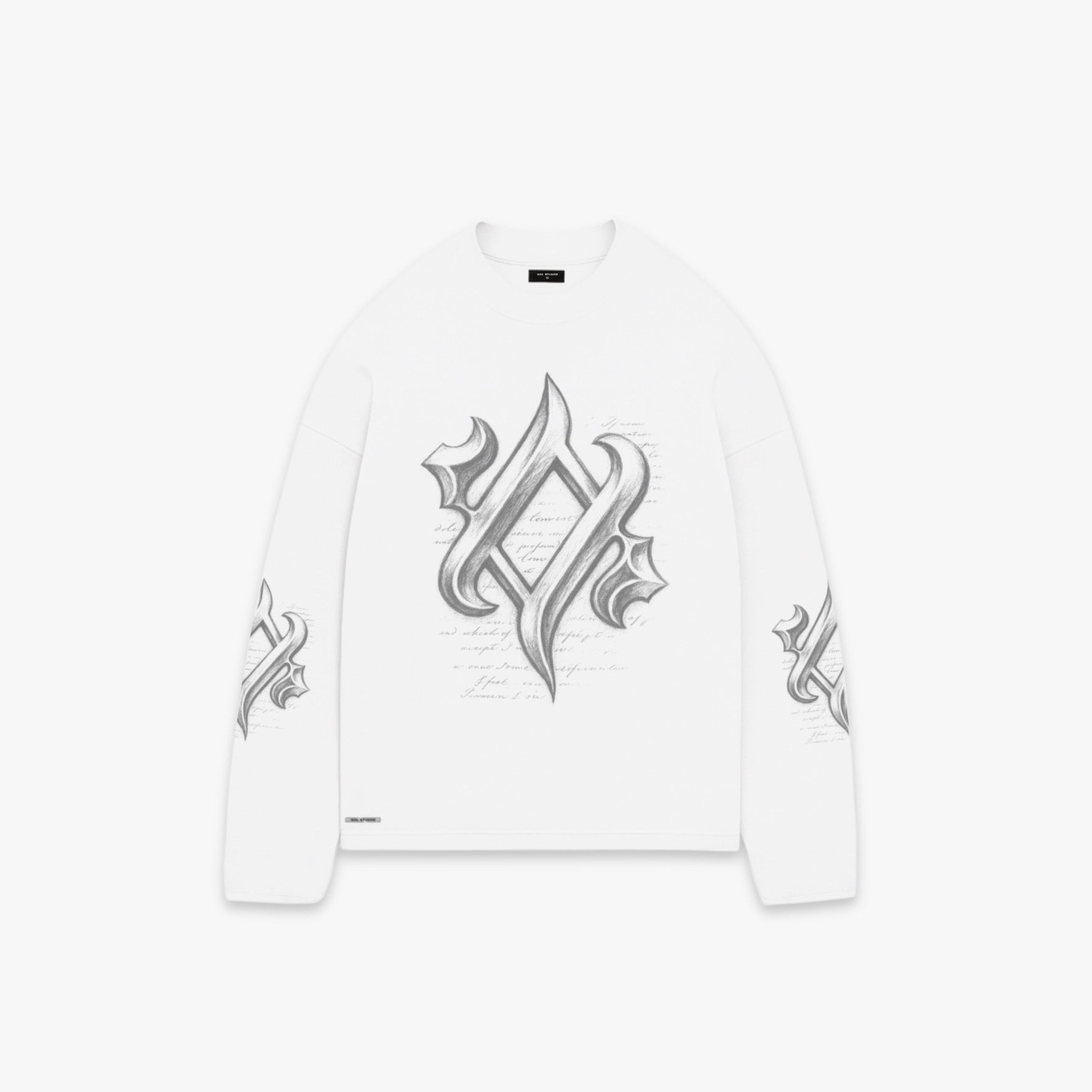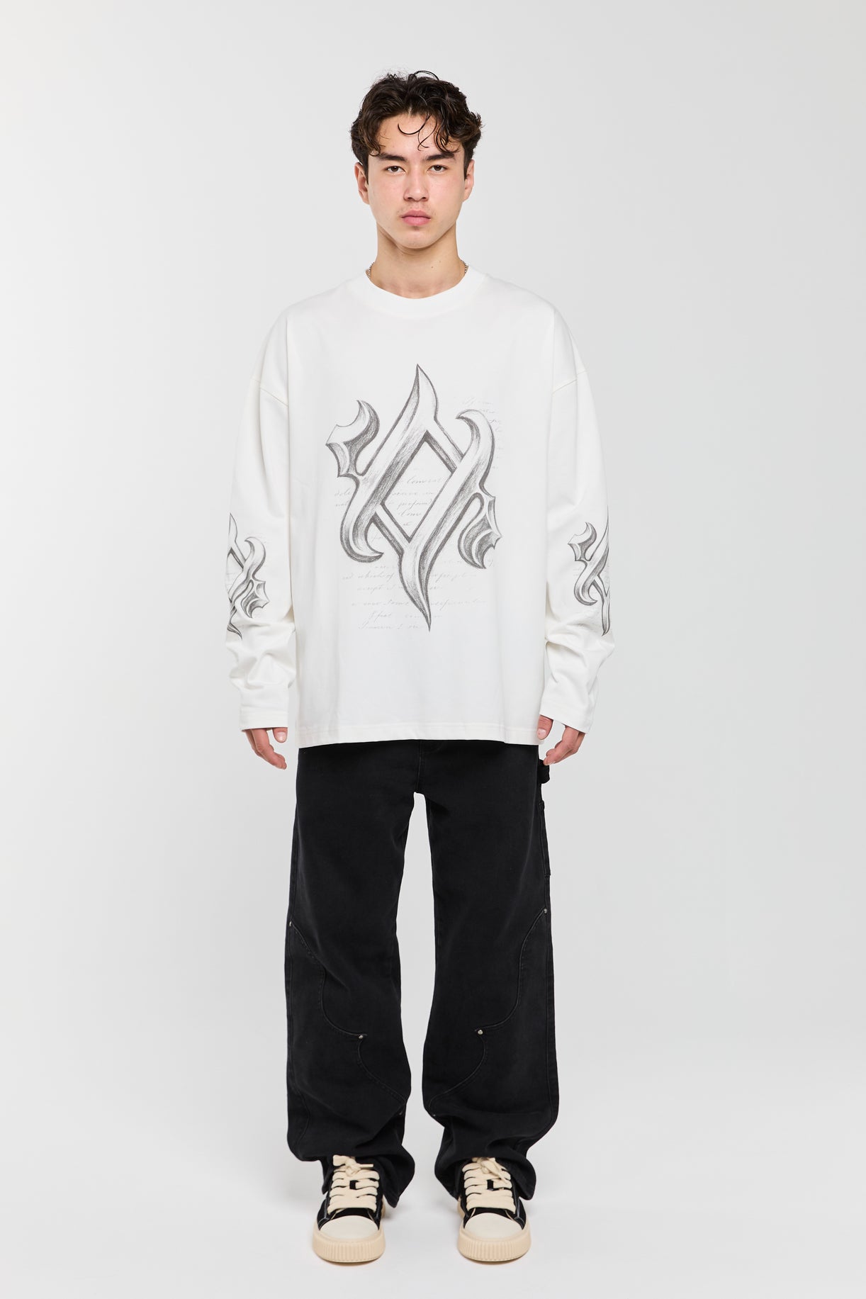 vintage white oversized fit long sleeve tee crafted from premium jersey cotton. Soft, pre-shrunk and garment dyed for a smooth, structured feel. Finished with bold graphic print on the front and sleeves.