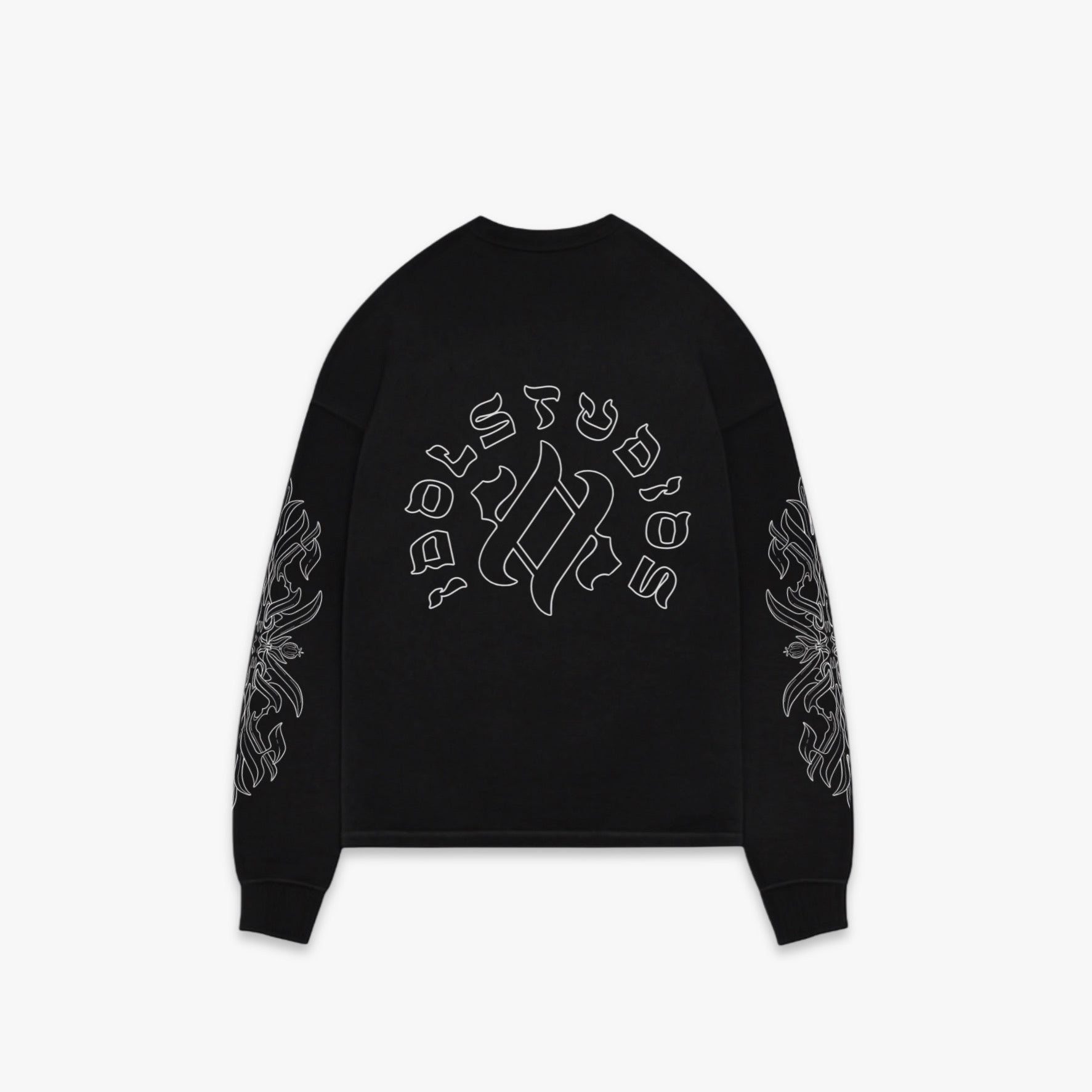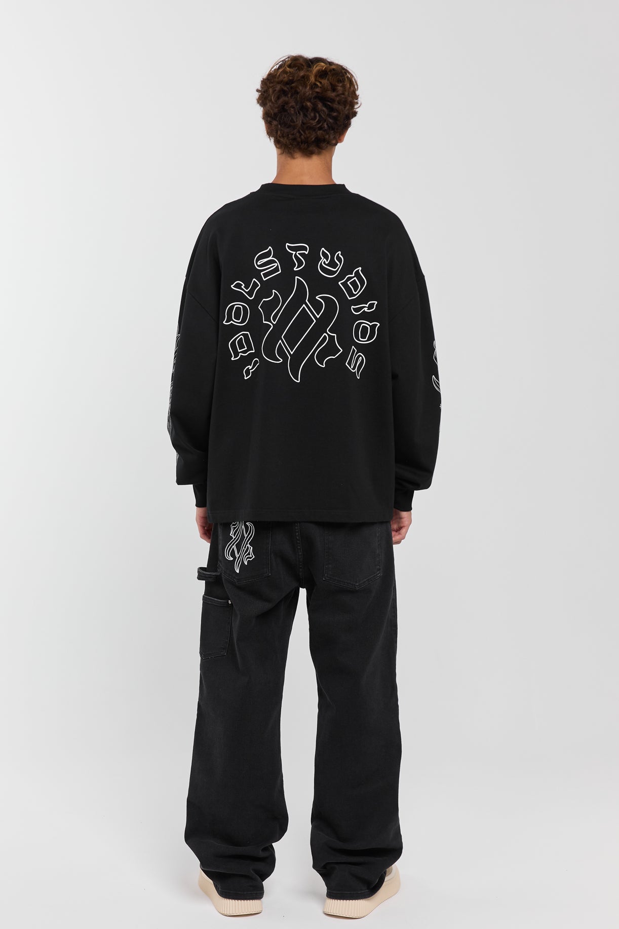 Black oversized fit long sleeve tee crafted from premium jersey cotton. Soft, pre-shrunk and garment dyed for a smooth, structured feel. Finished with bold graphic print on the back and along the sleeves.
